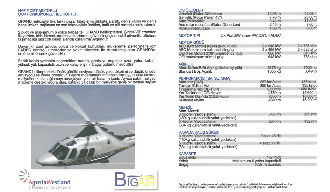 Grand Helikopterleri, Farklı Pazar Taleplerini Dikkate Alarak, Geniş Kabin ve Geniş Bagaj İmkanı Sağlayan En Son Teknolojiyle Üretilen, Hafif ve Çift Motorlu Helikopterdir. Dayanıklı Özel Gövde, Yolcu ve Kokpit Koltukları, Mükemmel Performans İçin FADEC Kontrollü Motorlar ve Yakıt Hücreleri İle Donatılmış Olan GRAND'da En Önemli Öncelik Güvenliktir.